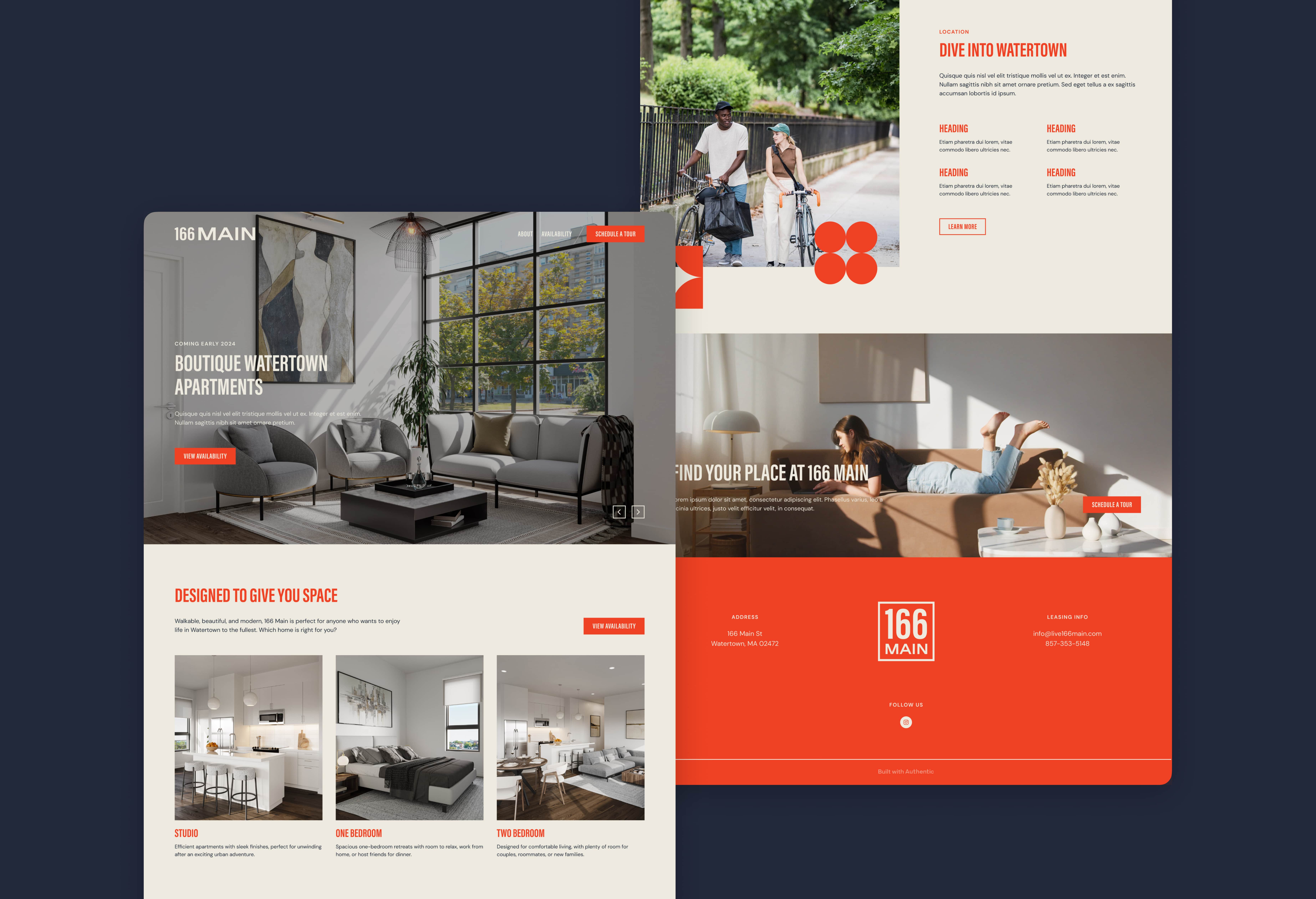 Authentic started by developing 166 Main's brand positioning around sophisticated urban living. Drawing inspiration from the exterior brickwork, we designed an elegant yet forward-thinking brand aesthetic.